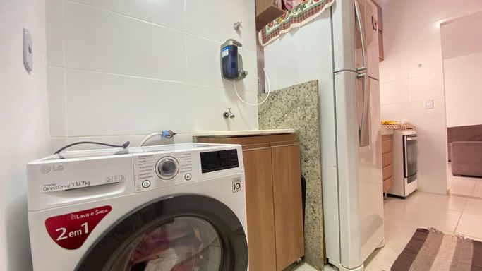 ✔️ Mobília inclusa: cama de casal, máquina lava e seca, geladeira, fogão, sofá, rack e poltrona